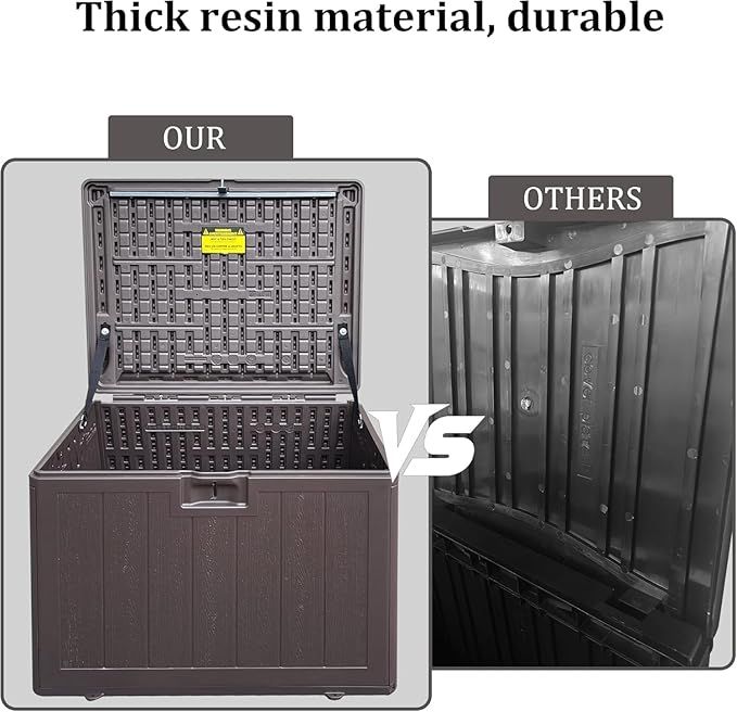 - Material: The patio outdoor storage box is made of the latest high-quality resin material, which makes this patio deck storage box waterproof,UV-resistant, anti-fading, and anti-bending protection, suitable for long-term outdoor use.