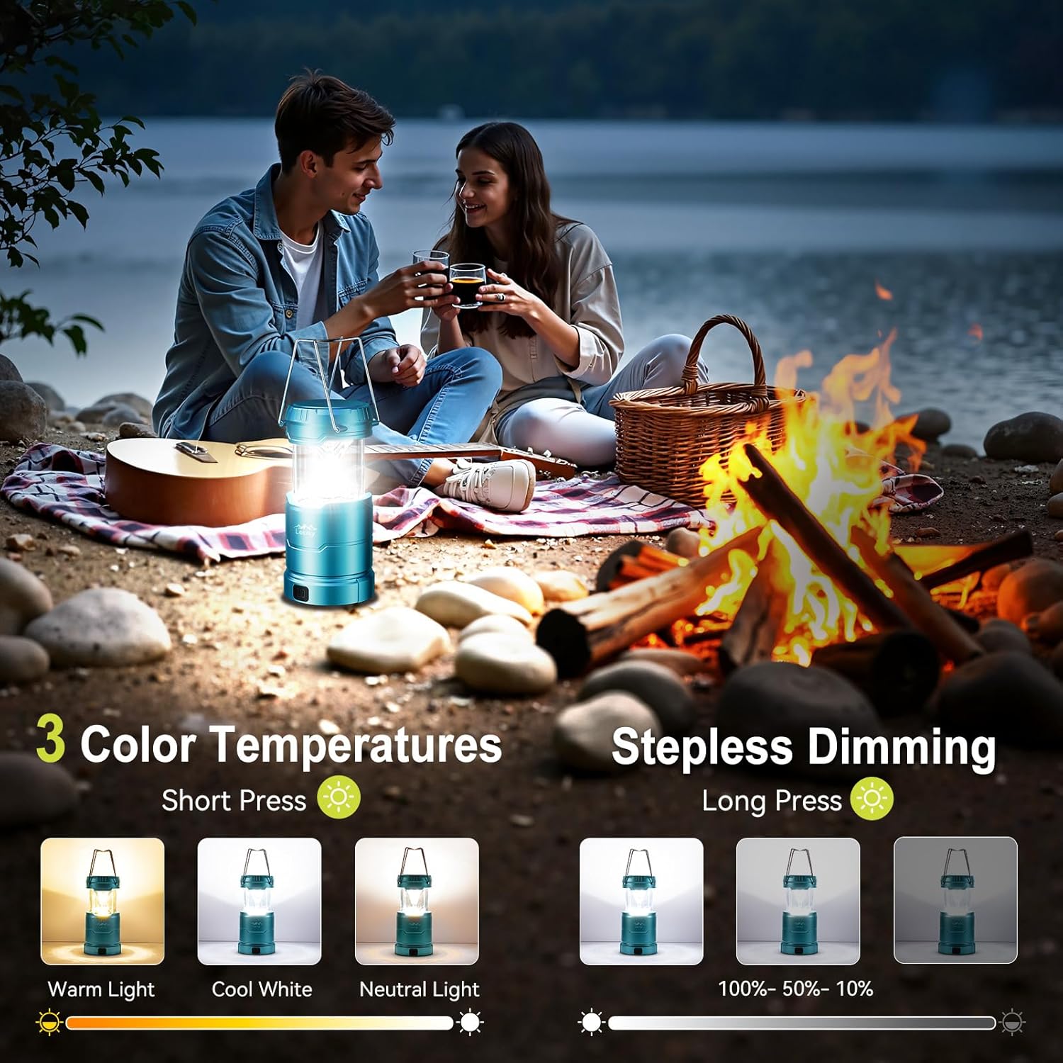 - 【3 Lighting Modes & Dimmable & Intelligent Memory】Short press of battery powered lantern to switch cold white, warm light and natural light modes, camping essentials meeting various scenarios. Long press of camping lanterns battery powered to achieve stepless dimming and adjust brightness as desired. The intelligent memory automatically saves your settings within 10 seconds and restores them on next startup, making battery operated lantern easy to create a personalized lighting environment