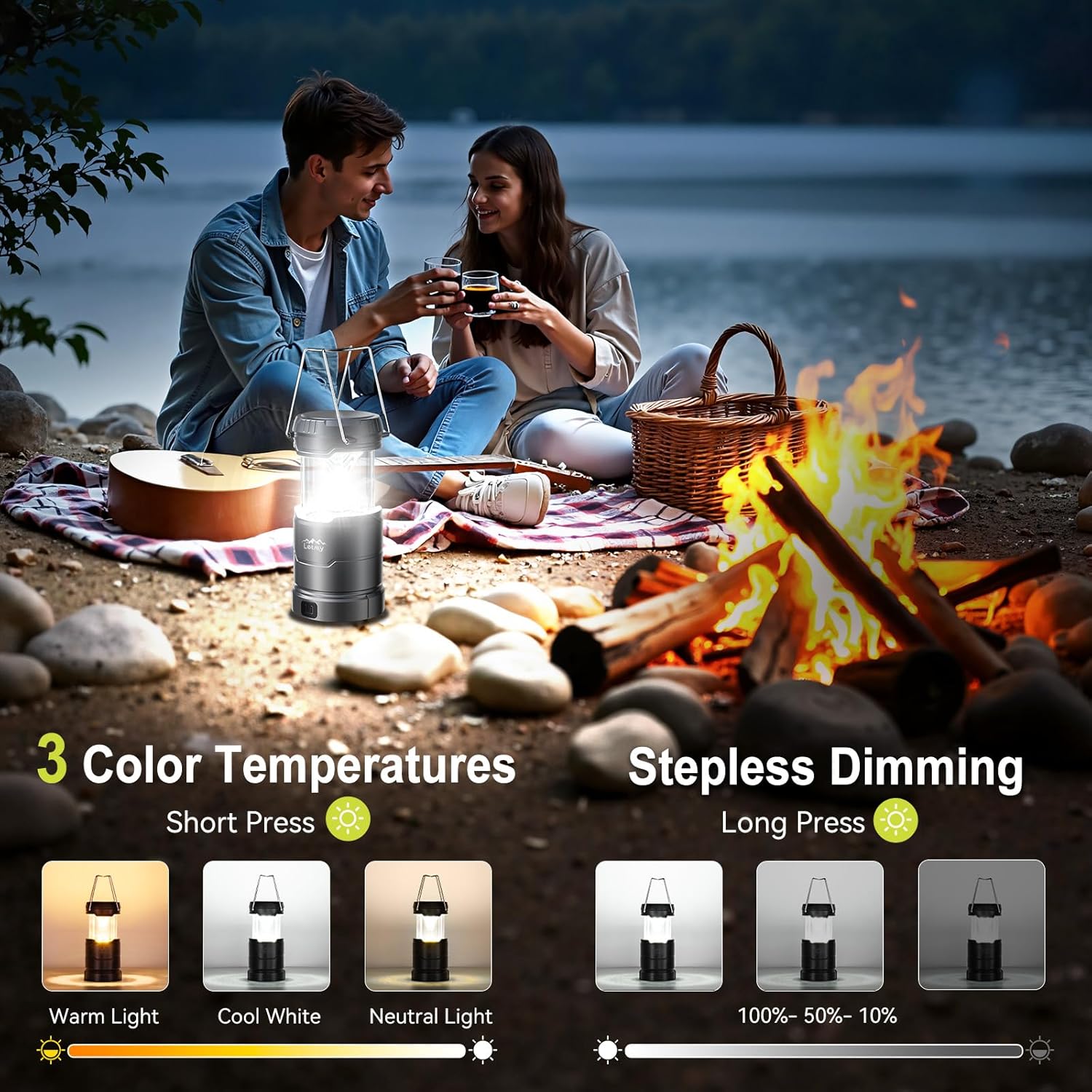 - 【3 Lighting Modes & Dimmable & Intelligent Memory】Short press of battery powered lantern to switch cold white, warm light and natural light modes, camping essentials meeting various scenarios. Long press of camping lanterns battery powered to achieve stepless dimming and adjust brightness as desired. The intelligent memory automatically saves your settings within 10 seconds and restores them on next startup, making battery operated lantern easy to create a personalized lighting environment
