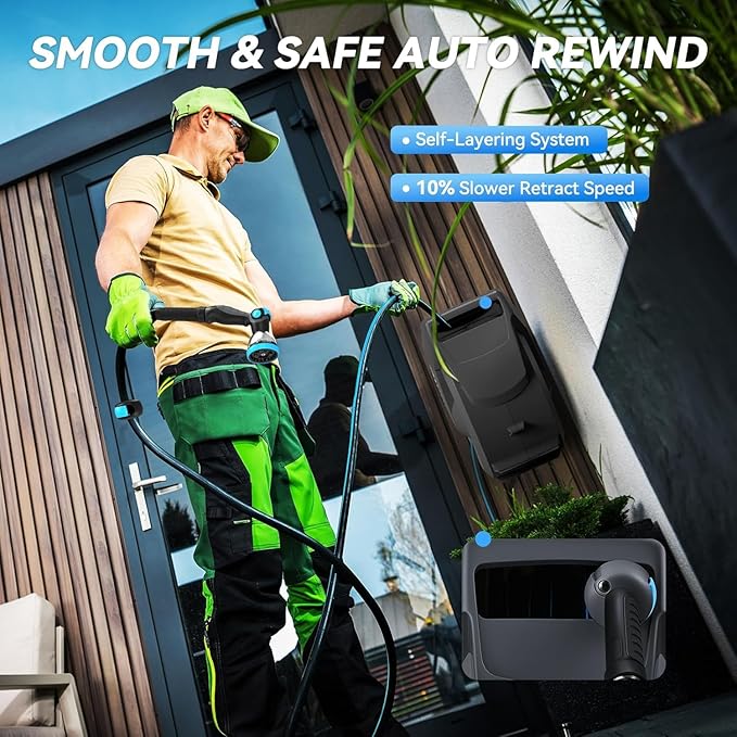 - Breezy Retraction, Automatically Tidy: No matter how far the hose is stretched, it can be retracted safely and slowly after a slight pull. Besides, the upgraded guide of the self-winding hose reel ensures a kink and tangle-free retraction, every time