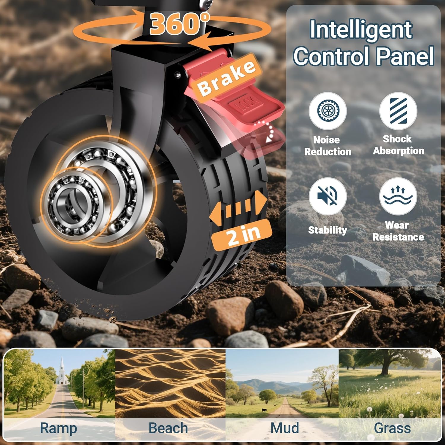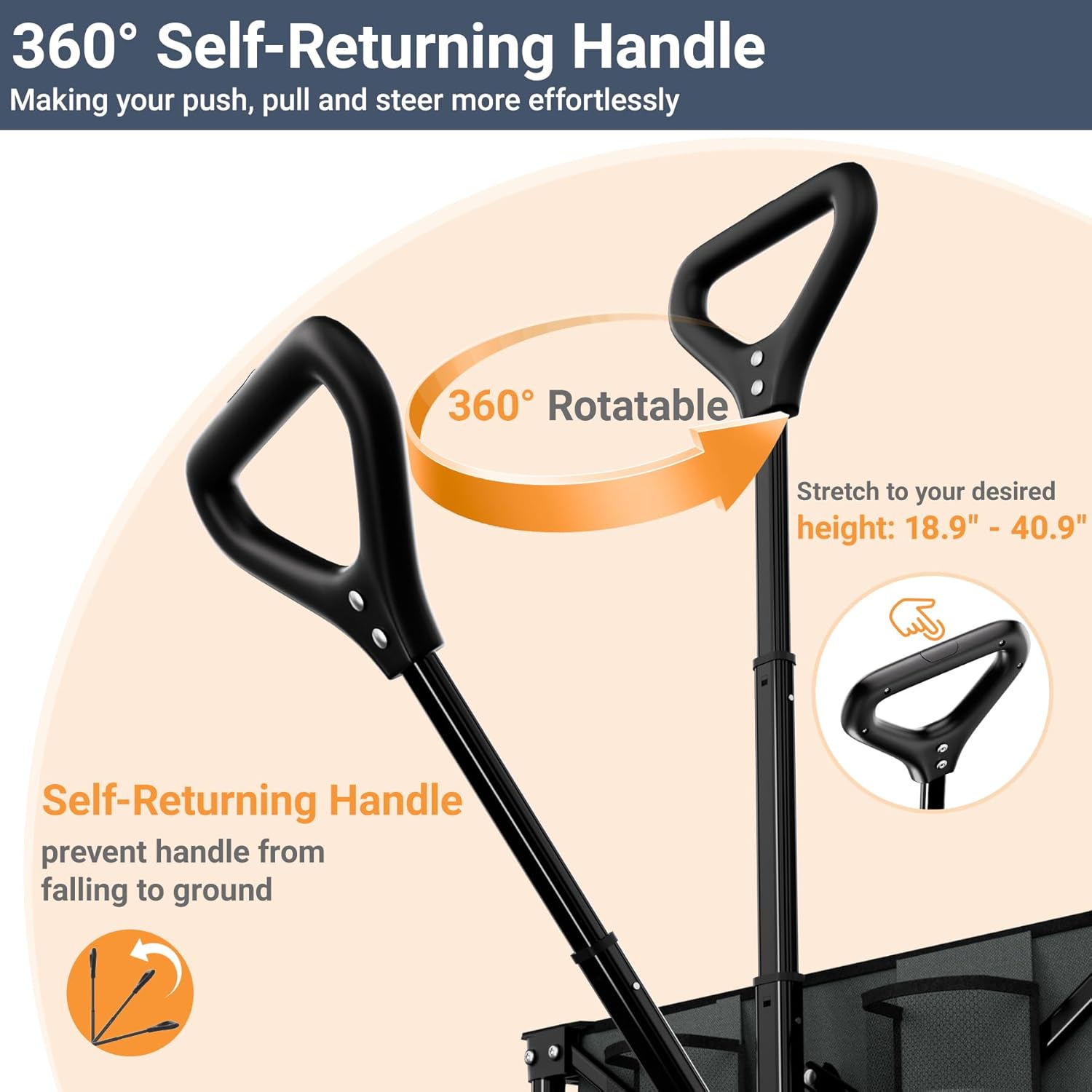- 【All-Terrain Wheels with Brake & Adjustable Handle】 - The folding wagon comes with two front 360° swiveling off-road wheels that have brakes, ensuring a smooth pull and easy transport on most kinds of ground surfaces like the cobbled road, asphalt, dust, and grass. The adjustable handle features rebound function will not drop to the ground, no need to bend down and pull up the handle!