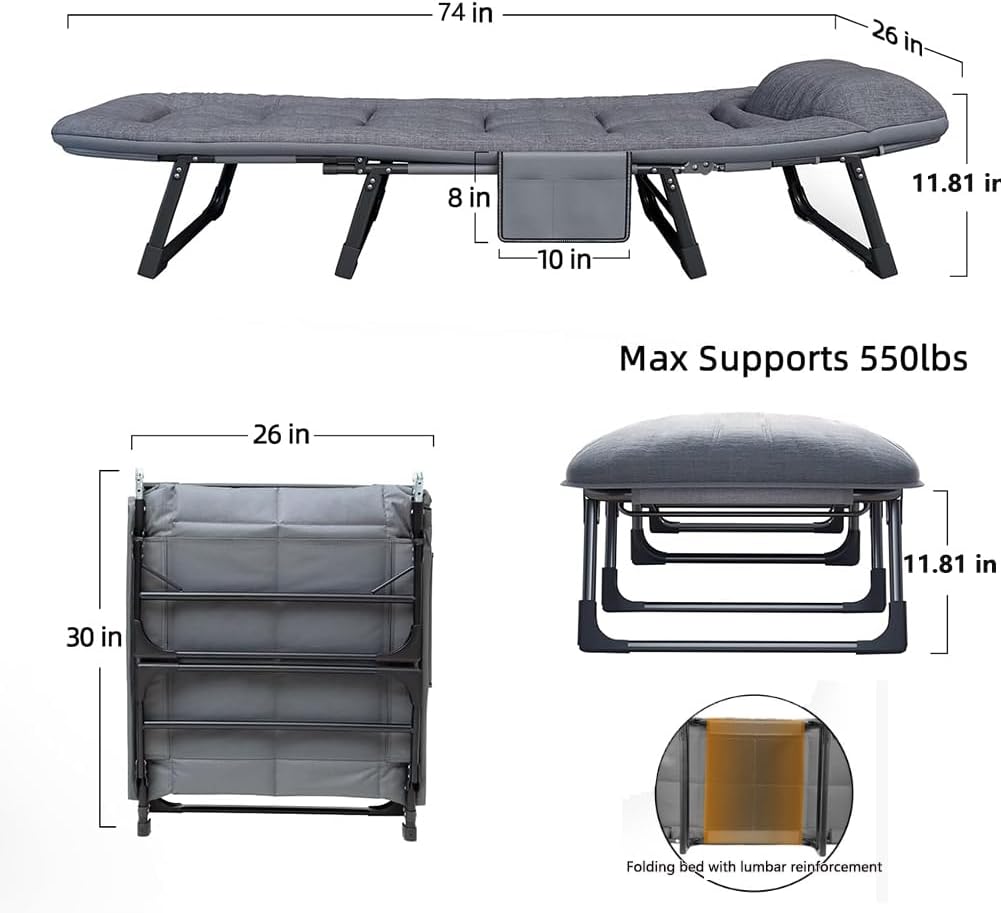 - Multifunctional 3 in 1 Folding Bed: Converts effortlessly from recliner to bed and lounge chair ideal for camping patio or small space living